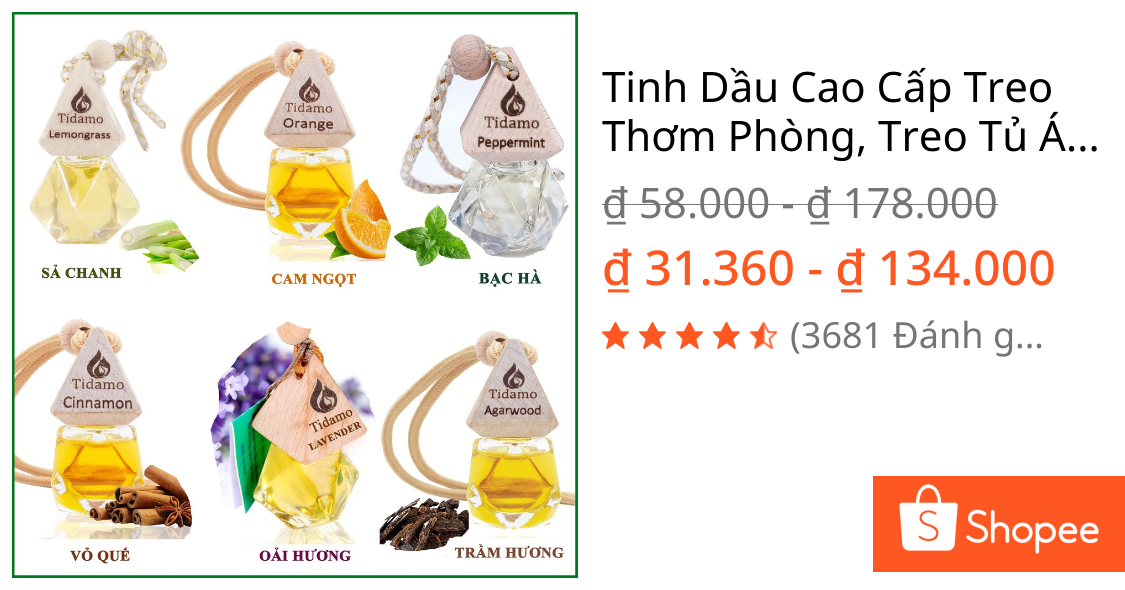 Tinh Dầu Cao Cấp Treo Xe TIDAMO từ Shopee đang là lựa chọn phổ biến với giá 31.360₫ (giảm 46% từ 58.000₫). Sản phẩm không chỉ khử mùi hiệu quả mà còn tạo hương thơm nhẹ nhàng, an toàn cho mọi thành viên gia đình.